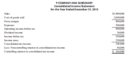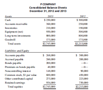 P COMPANY AND SU BSIDIARY Consolidated Income Statement for the Year Ended December 31, 2013 Saks S1,900,000 Cost af goods sold 1000,000 Gross margin 900,000 ExpensEN 300,000 Operating income before tax 600,000 Dividend income S0,000 Income before tax 550,000 220000 330 000 Income taxes Consolidated net income Less Noncontrolling interest in consolidated net income 66,000 Controlling interest in consolidated net income S 264,000 P COMPANY Consolida ted Ba lance Sheets December 31, 2012 and 2013 Assets 2013 2012 $ 250,000 $ 300,000 Cash Accounts reccivable 360,000 250,000 Inventories 210,000 190,000 Equipment (net) 950,000 S00,000 Long-em investments S00,000 800,000 Goodwill 175,000 175,000 Total assets $2,745,000 $2,215,000 Liabilities and Equày $ 268,000 260,000 $ 500,000 Accounts payable Accrued payabk Bonds payable Premium on bonds payable Noncontrolling inkest Common stock, $1 par value Other contribued capital 200,000 200,000 40,000 148,000 90,000 600,000 450,000 275,000 225,000 Retained camings 954,000 $2,745,000 750,000 Total equities $2,215,00