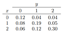 > Suppose that X and Y are independent random variables having the joint probability distribution Find (a) E(2X − 3Y ); (b) E(XY ). f(x, y) 4 0.10 0.15 3 0.20 1 0.30 0.10 0.15