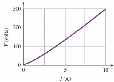 (b) The graph shows a V-I plot for the copper wire. What is the resistance of the wire when operating steadily at a current of 10 A?