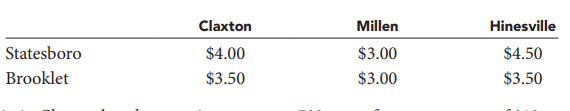 The gin in Claxton has the capacity to process 700 tons of cotton at a cost of $10 per ton. The gin in Millen can process 600 tons at a cost of $11 per ton. Each gin must use at least one half of its available capacity. The cost of shipping a ton of cotton from each gin to each distribution center is summarized in the following table: