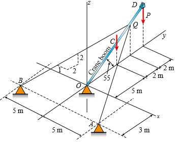 A crane boom of mass 450 kg with its center of mass at C is stabilized by two cables AQ and BQ (Ae = 304 mm2 for each cable) as shown in the figure. A load P = 20 kN is supported at point D. The crane boom lies in the y-z plane.