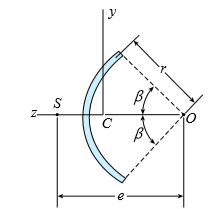 A cross section in the shape of a circular arc of constant thickness is shown in the figure. Derive the following formula for the distance e from the center of the arc to the shear center S: