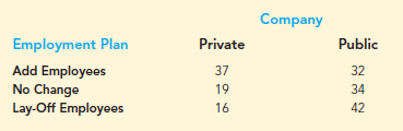 A Deloitte employment survey asked a sample of human resource executives how their company planned to change its workforce over the next 12 months. A categorical response variable showed three options: The company plans to hire and add to the number of employees, the company plans no change in the number of employees, or the company plans to lay off and reduce the number of employees. Another categorical variable indicated if the company was private or public. Sample data for 180 companies are summarized as follows.