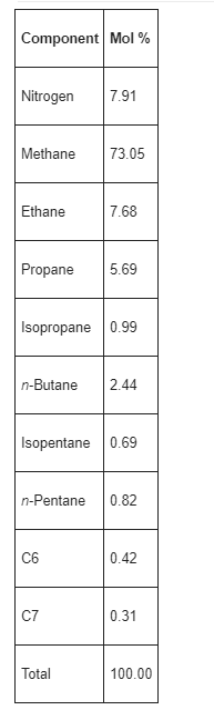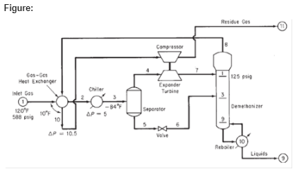 Figure: Residue Ges (1) Compressor Gos-Ges Heat Exchenger 125 psig Exponder Tubine Chiler Inlet Gos -84F AP - 5 Separator Demethonizer 120 10F 10 588 psig AP- 10.5 Valve Reboiler Liguids Component Mol % Nitrogen 7.91 Methane 73.05 Ethane 7.68 Propane 5.69 Isopropane 0.99 n-Butane 2.44 Isopentane 0.69 n-Pentane 0.82 C6 0.42 C7 0.31 Total 100.00