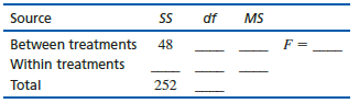 > The following summary table presents the results from an ANOVA comparing five treatment conditions with n = 5 participants in each condition. Complete all missing values. (Hint: Start with the df column.)