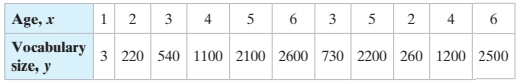 Age, r 1 2 3 4 5 6 3 5 2 4 6 Vocabulary size, y 3 220 540 1100 2100 2600 730 2200 260 1200 2500
