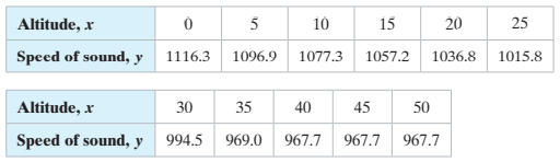 Altitude, x 5 10 15 20 25 Speed of sound, y 1116.3 1096.9 1077.3 1057.2 1036.8 1015.8 Altitude, x 30 35 40 45 50 Speed of sound, y 994.5 969.0 967.7 967.7 967.7