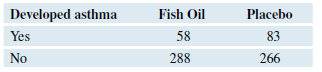 A double-blind study using random assignment was done of pregnant women in Denmark. Women were given fish oil or a placebo during pregnancy. Their children were followed during the first 5 years of life to see if they developed asthma. The results are summarized in the table. (Bisgaard et al., âFish Oil-Derived Fatty Acids in Pregnancy and Wheeze and Asthma in Offspring,â New England Journal of Medicine, vol. 375: 2530â2539. doi:10.1056/NEJMoa1503734)