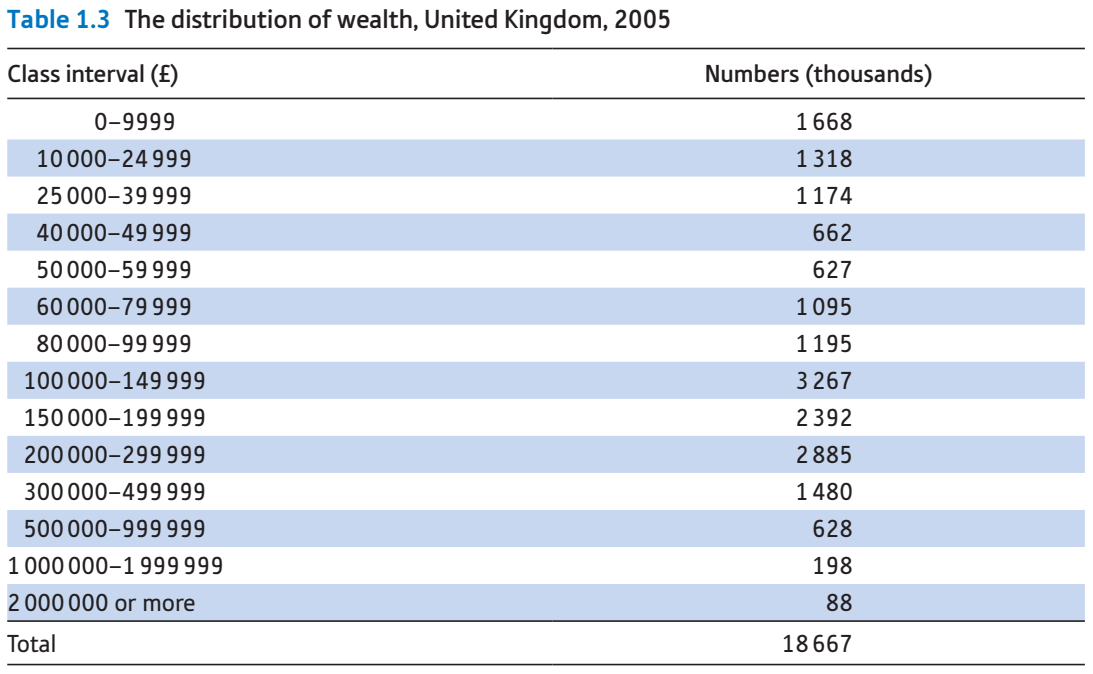 Table 1.3 The distribution of wealth, United Kingdom, 2005 Class interval (£) Numbers (thousands) 0-9999 1668 10 000-24 999 1318 25 000-39 999 1174 40 000-49 999 662 50 000-59 999 627 60 000-79999 1095 80 000-99 999 1195 100 000-149999 3 267 150 000-199999 2392 200 000-299999 2885 300 000-499 999 1480 500 000-999 999 628 1 000 000-1999 999 198 2 000 000 or more 88 Total 18 667