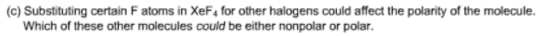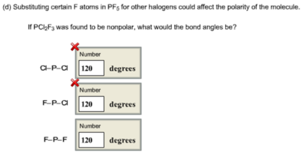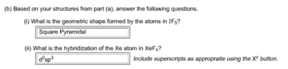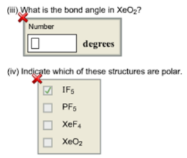 XeO2 XeF. PFs IFs 大 (b) Based on your structures from part (a), answer the following questions. () What is the geometric shape formed by the atorns in IFs? Square Pyramidal () What is the hybridization of the Xe atorm in XeF,? d'sp Include superscripts as appropraite using the X' button. ()What is the bond angle in XeO2? Number degrees (iv) Indicate which of these structures are polar. IFs PFs XeF4 XeO2 (c) Substituting certain F atoms in XeF4 for other halogens could affect the polarity of the molecule. Which of these other molecules could be either nonpolar or polar. XECIF3 XeCl 2 XeCl½F2 (d) Substituting certain F atoms in PFs for other halogens could affect the polarity of the molecule. If PC,F3 was found to be nonpolar, what would the bond angles be? Number C-P-a 120 degrees Number F-P-C 120 degrees Number F-P-F 120 degrees