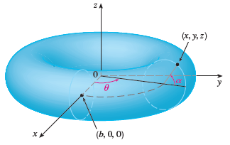 ![(a). Find a parametric representation for the torus obtained by rotating about the z-axis the circle in the xz-plane with center (b, 0, 0) and radius a < b. [Hint: Take as parameters the angles θ and α shown in the figure.]