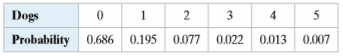Dogs 1 2 3 4 5 Probability 0.686 0.195 0.077 0.022 0.013 0.007