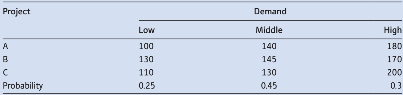 Project Demand Low Middle High A 100 140 180 B 130 145 170 C 110 130 200 Probability 0.25 0.45 0.3