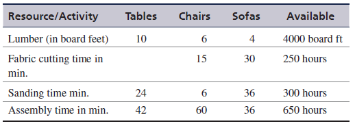 A furniture company produces tables, chairs, and sofas. The company uses lumber, fabric, and glass to produce these products. Labor performs the cutting, sanding, and assembly operations. The following table provides the resouce requirents of products.