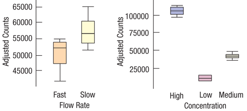 An experiment was performed to see whether slowing down the flow rate would increase total counts. A mixture was produced with three different Concentration levels: low, medium, and high. The two Flow Rates used were slow and fast. Each mixture was run 5 times and the total counts recorded each time. Partial boxplots for Concentration and Flow Rate show: