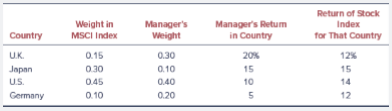 A global equity manager is assigned to select stocks from a universe of large stocks throughout the world. The manager will be evaluated by comparing her returns to the return on the MSCI World Market Portfolio, but she is free to hold stocks from various countries in whatever proportions she finds desirable. Results for a given month are contained in the following table: