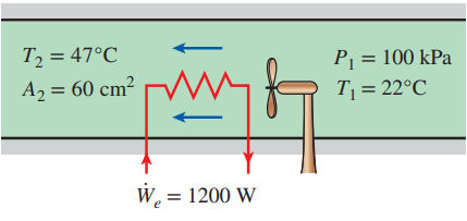 A hair dryer is basically a duct in which a few layers of electric resistors are placed. A small fan pulls the air in and forces it through the resistors where it is heated. Air enters a 1200-W hair dryer at 100 kPa and 22°C and leaves at 47°C. The cross-sectional area of the hair dryer at the exit is 60 cm2. Neglecting the power consumed by the fan and the heat losses through the walls of the hair dryer, determine (a) the volume flow rate of air at the inlet and (b) the velocity of the air at the exit.
