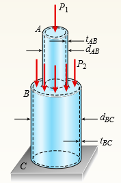 A hollow circular post ABC (see figure) supports a load P1 = 1700 lb acting at the top. A second load 2 P is uniformly distributed around the cap plate at B. The diameters and thicknesses of the upper and lower parts of the post are dab = 1.25 in, tab = 0.5 in, dbc = 2.25 in, and tbc = 0.375 in, respectively.