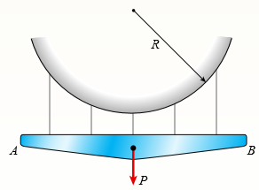 A horizontal rigid bar AB supporting a load P is hung from five symmetrically placed wires, each of cross-sectional area A (see figure). The wires are fastened to a curved surface of radius R.