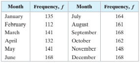 Month Frequency, f Month Frequency, f January 135 July 164 February March 112 161 August September 141 168 April 132 October 162 May 141 November 148 June 168 December 168