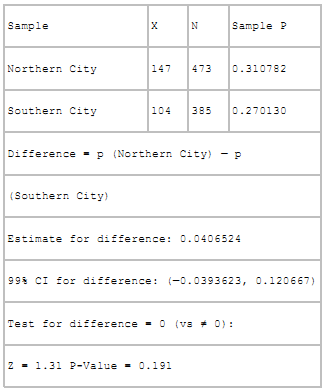 A large manufacturing company produces computer printers that are distributed and sold all over the United States. Due to lack of industry information, the company has a difficult time ascertaining its market share in different parts of the country. They hire a market research firm to estimate their market share in a northern city and a southern city. They would also like to know whether there is a difference in their market shares in these two cities; if so, they want to estimate how much. The market research firm randomly selects printer customers from different locales across both cities and determines what brand of computer printer they purchased. The following Minitab output shows the results from this study. Discuss the results including sample sizes, estimation of the difference in proportions, and any significant differences determined. What were the hypotheses tested?