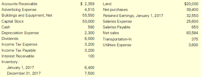 Accounts Receivable $ 2,359 Land $20,000 Advertising Expense 4,510 Net purchases 39,400 Buildings and Equipment, Net 55,550 Retained Earnings, January 1, 2017 Salaries Expense Salaries Payable 32,550 Capital Stock 50,000 25,600 Cash 590 650 Depreciation Expense 2,300 Net sales 83,584 Dividends 6,000 Transportation-In 375 Income Tax Expense 3,200 Utilities Expense 3,600 Income Tax Payable 3,200 Interest Receivable 100 Inventory: January 1, 2017 6,400 December 31, 2017 7,500