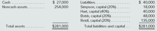 Cash $ 27,000 $ 40,000 Liabilities. Simpson, capital (20%). Hart, capital (40%). Bobb, capital (20%) . Reidl, capital (20%) . Total liabilities and capital. .. Noncash assets. 254,000 18,000 40,000 48,000 135,000 ....... .... ..... Total assets $281,000 $281,000