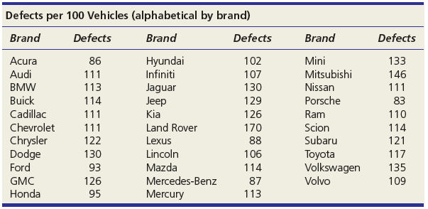 (a) Make a stem-and-leaf plot for the number of defects per 100 vehicles for these 32 brands. (b) Make a dot plot of the defects data. (c) Describe these two displays. (Hint: Refer to center, variability, and shape.)