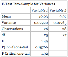 A manufacturing company produces plastic pipes that are specified to be 10 inches long and 1/8 inch thick with an opening of 3/4 inch. These pipes are molded on two different machines. To maintain consistency, the company periodically randomly selects pipes for testing. In one specific test, pipes were randomly sampled from each machine and the lengths were measured. A statistical test was computed using Excel in an effort to determine whether the variance for machine 1 was significantly greater than the variance for machine 2. The results are shown here. Discuss the outcome of this test along with some of the other information given in the output.