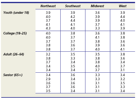 A market research firm is testing consumer reaction to a new shampoo on four age groups in four regions. There are five consumers in each test panel. Each consumer completes a 10-question product satisfaction instrument with a 5-point scale (5 is the highest rating) and the average score is recorded. Are the main effects significant? Is there an interaction?