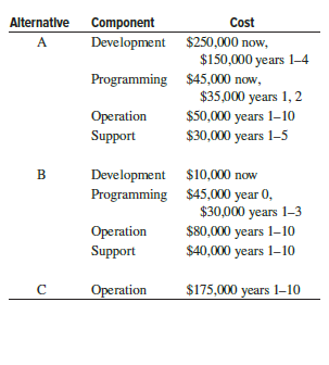 A medium-size municipality plans to develop a software system to assist in project selection during the next 10 years. A life-cycle cost approach has been used to categorize costs into development, programming, operating, and support costs for each alternative. There are three alternatives under consideration, identified as A (tailored system), B (adapted system), and C (current system). Use an annual life-cycle cost approach to identify the best alternative at 8% per year.