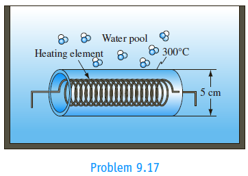 A metal-clad electrical heating element of cylindrical shape, as shown in the sketch below, is immersed in water at atmospheric pressure. The element is 5-cm OD, and heat generation produces a surface temperature of 3008C. Estimate the heat flux under steady-state conditions and the rate of heat generation per unit length.