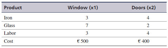 A metal shop fabricates windows and doors to construction companies. To fabricate these, the shop uses iron, glass, and labor. The company has 80 units of standard size iron, 60 square feet of glass, and unlimited hours of labor but the shop has to use 50 hours of labor. The following table shows the requirement of these resources to produce one window and one door.