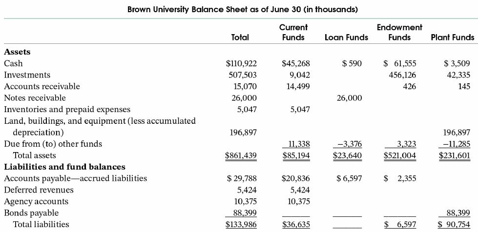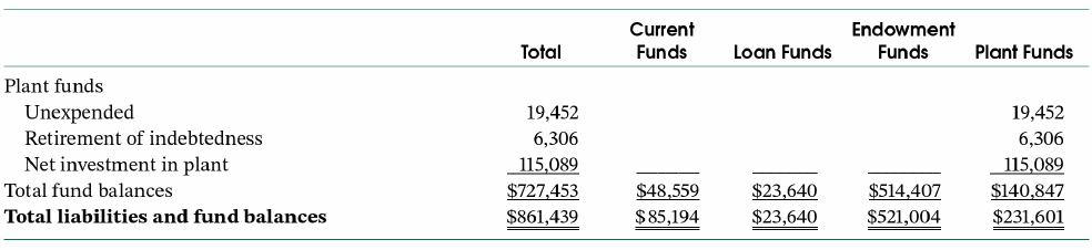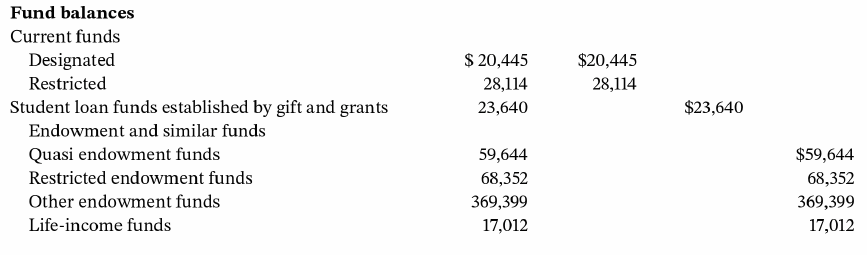 Recast the fund balance (net asset) section of the balance sheet so that it presents the fund balances in the two categories required by ASU 2014-09. Show the balances in a single column, divided into two sections. Thus, for example, current undesignated funds should be reported in the without donor restrictions section; current restricted funds in the with donor restrictions section. Assume that the plant funds, other than the net investment in plant, are donor restricted, and make other appropriate assumptions as to the type of restriction that applies to each of the other fund balances.