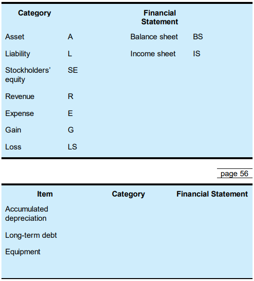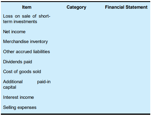 A number of financial statement captions are listed in the following table. Indicate in the spaces to the right of each caption the category of each item and the financial statement(s) on which the item can usually be found. Use the following abbreviations: