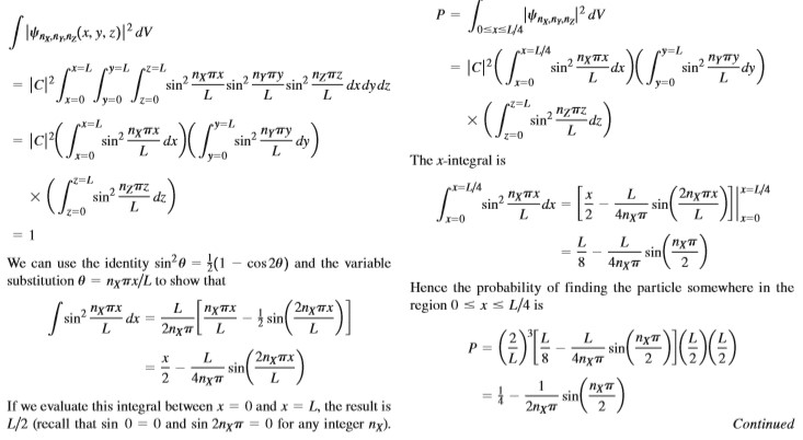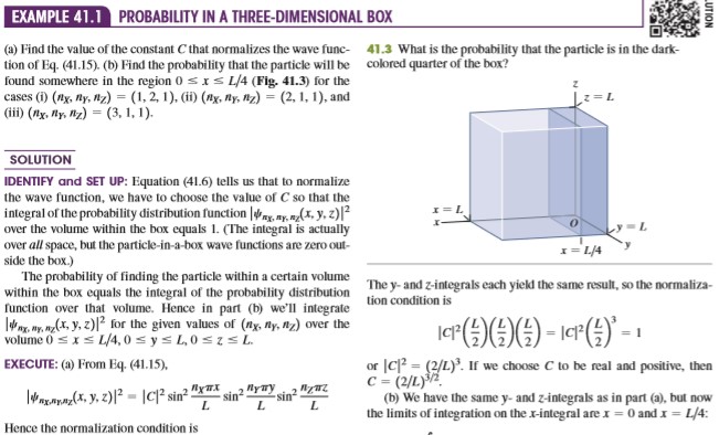 EXAMPLE 41.1 PROBABILITY IN A THREE-DIMENSIONAL BOX (a) Find the value of the constant C that normalizes the wave func- 41.3 What is the probability that the particle is in the dark- tion of Eq. (41.15). (b) Find the probability that the particle will be colored quarter of the box? found somewhere in the region 0 sxs L/4 (Fig. 41.3) for the cases (1) (nx, ny, n2) = (1,2, 1), (ii) (nx, ny, nz) = (2, 1, 1), and (ii) (x, ny, H2) = (3, 1, 1). SOLUTION IDENTIFY and SET UP: Equation (41.6) tells us that to normalize the wave function, we have to choose the value of C so that the integral of the probability distribution function |ag, my. m(x, y, 2)[? over the volume within the box equals 1. (The integral is actually over all space, but the particle-in-a-box wave functions are zero out- side the box.) I= L/4 The probability of finding the particle within a certain volume within the box equals the integral of the probability distribution The y- and z-integrals each yield the same result, so the normaliza- function over that volume. Hence in part (b) we'll integrate IWm my.mglx, y, z)|² for the given values of (nyx, ny, n2) over the volume 0 =x= L/4,0 s y= L,0 = z