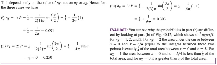 b. Calculate the probability that the particle will be found somewhere between x = L/4 and x = L/2. Compare your results to the result of Example 41.1 for the probability of finding the particle in the region x = 0 to x = L/4.