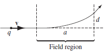 A particle of charge q enters a region of uniform magnetic ï¬eld B (pointing into the page). The ï¬eld deï¬ects the particle a distance d above the original line of ï¬ight, as shown in Fig. 5.8. Is the charge positive or negative? In terms of a, d, B and q, ï¬nd the momentum of the particle.