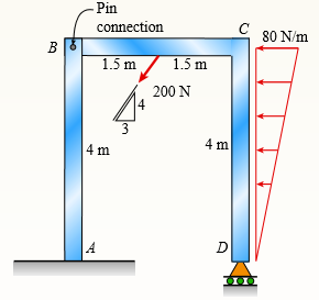 A plane frame is restrained at joints A and D, as shown in the figure. Members AB and BCD are pin connected at B. A triangularly distributed lateral load with peak intensity of 80 N/m acts on CD. An inclined concentrated force of 200 N acts at the mid-span of BC.