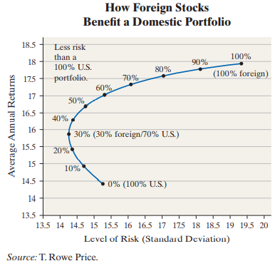 A popular theory in investment states that you should invest a certain amount of money in foreign investments to reduce your risk. The risk of a portfolio is defined as the standard deviation of the rate of return. Refer to the graph, which depicts the relation between risk (standard deviation of rate of return) and reward (mean rate of return).