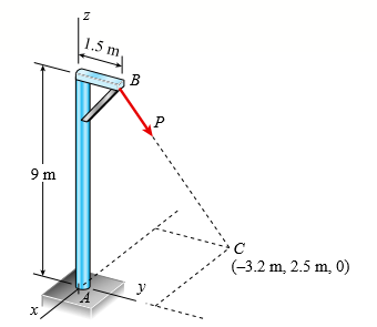 (a) Calculate the maximum tensile stress Ïmax and maximum in-plane shear stress Ïmax at point A on the outer surface of the post along the x axis due to the load P. Load P acts at B along line BC.