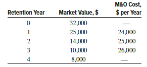 A presently owned machine has the projected market value and M&O costs shown below. An outside vendor of services has offered to provide the service of the existing machine at a fixed price per year. If the presently owned machine is replaced now, the cost of the fixed-price contract will be $33,000 per year. If the presently owned machine is replaced next year or any time after that, the contract price will be $35,000 per year. Determine if and when the defender should be replaced with the outside vendor using an interest rate of 10% per year. Assume used equipment similar to the defender will always be available, but that the current equipment will not be retained more than three additional years.