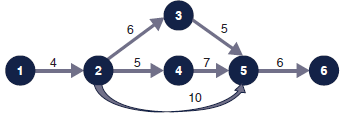 A project has six activities on arcs as shown in the diagram. The values on the arcs are the duration of activities in days.