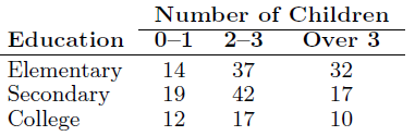 Number of Children Education 0–1 2–3 Over 3 Elementary Secondary College 14 37 32 19 42 17 12 17 10