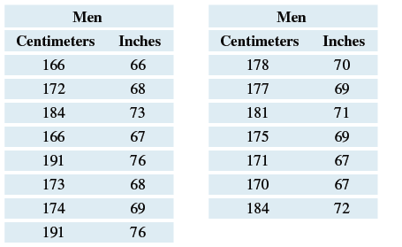 A random sample of students at Oxnard College reported what they believed to be their heights in inches. Then the students measured each othersâ heights in centimeters, without shoes. The data shown are for the men. Assume that the conditions for t-tests hold.