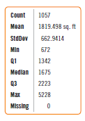 200 150 100 50 1000 2000 3000 4000 5000 Living Space Area (sq. ft) kouarbay Count 1057 Мean 1819.498 sq. ft StdDev 662.9414 Min 672 Q1 1342 Medlan 1675 Q3 2223 Max 5228 Missing