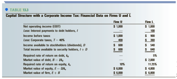 TABLE 13.3 Capital Structure with a Corporate Income Tax: Financial Data on Firms U and L Firm U Firm L Net operating income (EBIT) Less: Interest payments to debt holders, I $ 1,0 $ 1,000 100 $ 1,000 $ 900 $ 360 Income before taxes Less. Corporate taxes, T= 40% 400 Income available to stockholders (dividends), D Total income available to security holders, I+ D $ 600 $ 600 $ 540 $ 640 5% Required rate of return on debt, ka Market value of debt, B = Vka Required rate of return on equity, k, Market value of equity, E= D/k. Market value of firm, E+ B $ 2,000 11.25% $ 4,800 $ 6,800 10% $ 6,000 $ 6,000