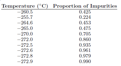Temperature (°C) Proportion of Impurities -260.5 0.425 0.224 -255.7 -264.6 0.453 -265.0 0.475 -270.0 0.705 -272.0 0.860 0.935 0.961 -272.5 -272.6 -272.8 0.979 -272.9 0.990