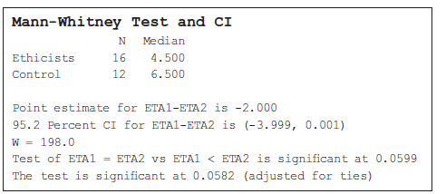 > Random samples of 30 professors of ethics and 30 professors in other disciplines (not ethics) were asked how many days it had been since they contacted their mothers; this included phone calls and face-to-face meetings. Professors whose mothers were not