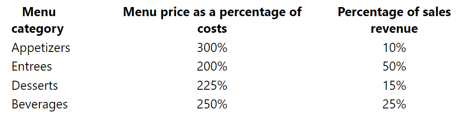 A restaurant owner sets her menu prices at a predetermined percentage of her input costs for food, ingredients, and beverages. The second column of the following table shows the prices as a percentage of these costs for various menu categories. The third column shows the breakdown of the restaurantâs overall revenue from the four menu categories.